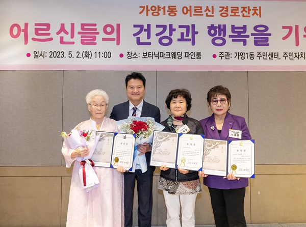 이어 보타닉파크웨딩 홀 지하 2층 연회장에서 열린 가양1동 어버이날 경로 행사장도 찾은 김 구청장은 행사에 참석한 노인들께 표창장을 전달하고 노고를 칭찬 했다.