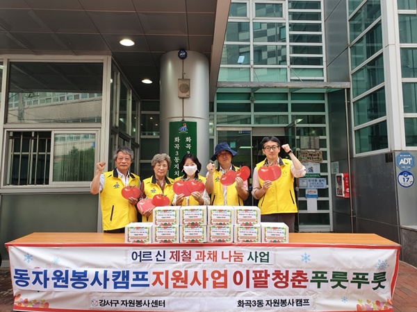 (서울=NSP통신) 강은태 기자 = 서울시 강서구 화곡3동 자원봉사캠프(캠프장 홍범기)는 지역 내 거동이 어려운 저소득 홀몸 어르신 10가구에 제철 과일을 직접 배달하고 안부를 확인하는 ‘이팔청춘 푸룻푸룻’ 사업을 추진하고 있다.