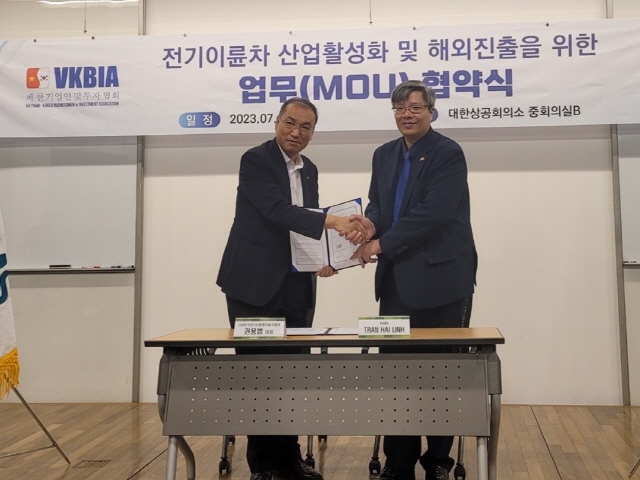 NSP통신-19일 대한상공회의소 중회의실에서 권용범 한국전기이륜형자동차협회 이사장(왼쪽)과 쩐 하이 린 VKBIA(베·한 기업인 및 투자협회)회장이 전기이륜차 산업 활성화와 인력 양성 및 아세안 시장 중심의 해외 진출을 위한 업무협약을 체결하고 기념촬영 하는 모습. (사진 = 김종식 기자)