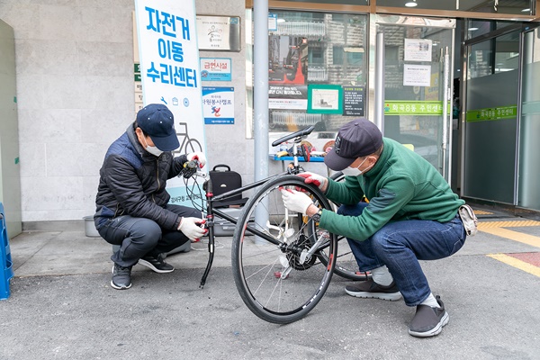 자전거 이동수리센터는 자전거를 타는 주민들에게 저렴한 비용의 수리 서비스를 제공하고 자전거 이용 활성화로 개인 건강 증진과 탄소 중립 실현을 위해 구가 추진 중이며 지역 공동체 일자리사업에 참여한 전문가들이 타이어 펑크 수리와 브레이크 및 변속기 조정 등을 지원한다.