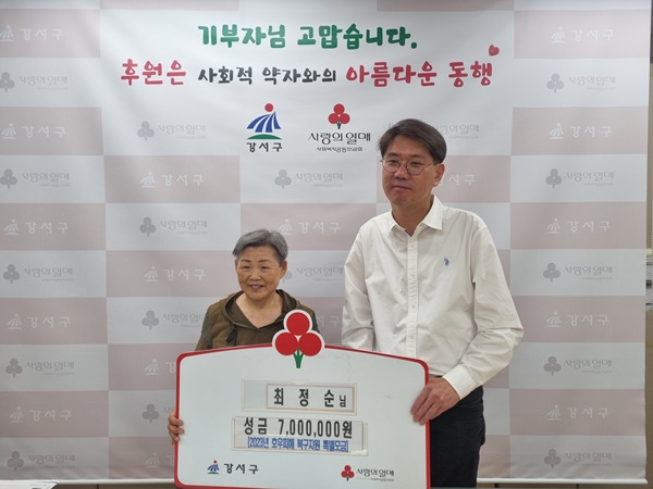 (서울=NSP통신) 강은태 기자 = 서울시 강서구에 따르면 정도가 심한 호흡기 장애의 기초 수급자인 최정순 할머니가 호우 피해를 입은 고향에 사용해 달라며 방화3동 주민센터를 방문해 5만 원권 지폐 140장이 든 돈 봉투 700만원을 강서구에 전달해 화제다.
