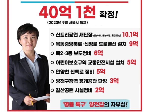 (서울=NSP통신) 강은태 기자 = 조수진 국민의힘 국회의원(서울양천갑당협위원장)은 20일 서울시로부터 양천갑(목1·2·3·4·5동 신정1·2·6·7동) 구민 편의·안전 여건 개선사업에 필요한 40억 1000만원의 특별교부금이 확정됐다고 밝혔다.