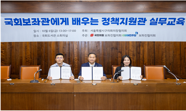 한편 서울특별시구의회의장협의회 최동철 회장은 “이번 교육과 협약을 통해 국회 보좌진의 생생한 노하우가 지방의회에 전수되고, 기초의회 정책지원관과 구의회 보좌진 사이에 교류가 확대되는 좋은 기회가 되기를 바란다”고 말했다.
