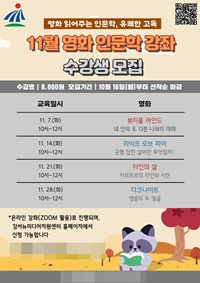 (서울=NSP통신) 강은태 기자 = 서울시 강서구(구청장 진교훈)가 오는 11월 7일부터 28일까지 4주간 ‘영화 인문학 강좌’를 운영한다.