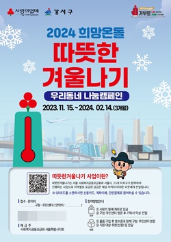 (서울=NSP통신) 강은태 기자 = 서울시 강서구(구청장 진교훈)가 2024년 2월 14일까지 3개월간 ‘2024 희망 온돌 따뜻한 겨울나기(이하 따겨)’ 사업을 추진하며 다 함께 행복한 강서 만들기에 나섰다.