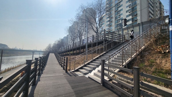 구는 지난 4월 안양천 진출입로 일부 구간의 가파른 계단을 없애고 완만한 데크로드를 설치했으나 계단으로 된 하부 진출입로는 장애인과 유모차, 노약자 등이 이용하기가 불편해 시설을 개선해 달라는 목소리가 지속적으로 제기돼 왔다.