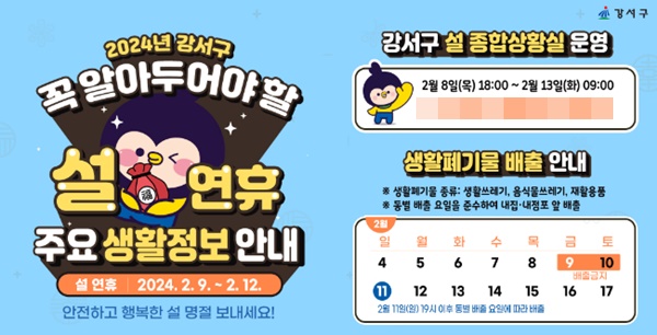 (서울=NSP통신) 강은태 기자 = 서울시 강서구(구청장 진교훈)가 설을 앞두고 주민들이 안전하고 따뜻한 연휴를 보낼 수 있도록 ‘2024 설 종합대책’을 본격 가동한다.