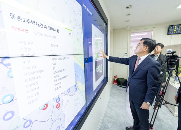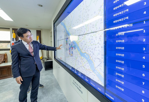 이는 지역 균형발전의 핵심 과제로 꼽히는 재개발·재건축의 신속 추진과 주거환경 개선에 대한 진 구청장의 강한 의지를 드러낸 것으로 상황판은 지역에서 진행 중인 모든 정비사업 현황을 실시간으로 파악할 수 있도록 구성됐다.