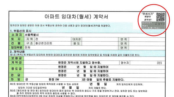 부동산 안심 QR계약서는 전세 사기 예방 및 대처방안에 대한 정보를 담은 QR코드가 찍힌 임대차 계약서다.