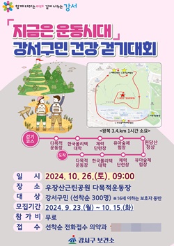 (서울=NSP통신) 강은태 기자 = 서울시 강서구(구청장 진교훈)가 오는 10월 26일 ‘지금은 운동 시대, 강서구민 건강 걷기 대회’를 개최한다.