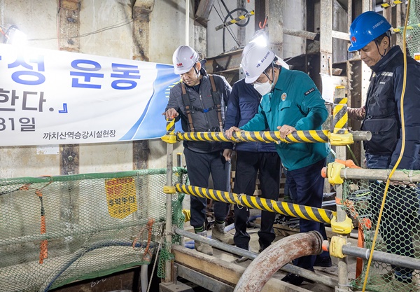 (서울=NSP통신) 강은태 기자 = 진교훈 서울시 강서구청장은 4일 강추위 속에도 지하철 5호선 까치산역을 찾아 지하 1층 대합실과 지하 5층 승강장을 연결하는 엘리베이터 설치 공사 현장 등 시설물 안전관리 사항을 점검했다.