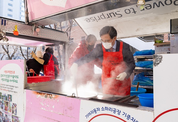 이날 가양5종합사회복지관 앞 주차장에는 이른 아침부터 ‘한국SNS연합회의 사랑의 짜장차(푸드트럭) 봉사자들이 음식 준비했고 진 구청장도 앞치마를 두른 채 짜장차에 올라 면을 삶고 배식 봉사를 하며 일손을 더했다.