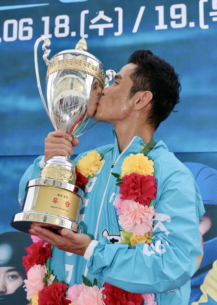 19일 미사경정장에서 열린 ‘2025 KBOAT 경정 왕중왕전’에서 김완석이 우승 트로피에 입맞춤하며 우승을 자축하고 있다. (사진 = 국민체육진흥공단)