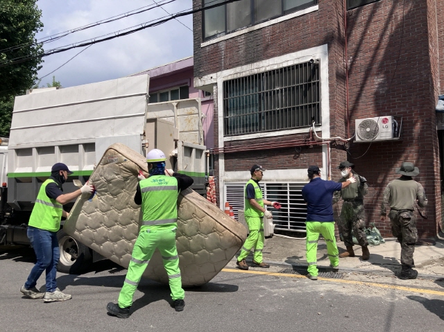 오전 10시부터 시작된 수해 복구 작업은 오후 3시가 돼서야 마무리됐다. 이날 12가구에 대한 수해 복구가 이뤄졌다. 수거한 폐기물은 무려 35톤에 달했다.