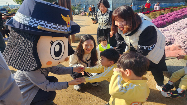 NSP통신-포항남부경찰서는 아동학대 예방의 날(11.19.)을 맞아 지난 9일 포항시 남구 상도동 뱃머리 마을 국화전시회에서 관내 어린이집 아동 100명과 함께 아동학대 예방 캠페인을 전개했다. (사진 = 포항남부경찰서)