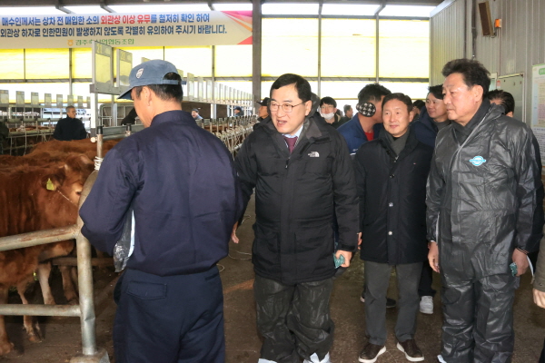 NSP통신-주낙영 경주시장이 20일 불국동 소재 경주가축시장을 찾아 한우 거래 현장을 둘러보고 축산농가 및 관계자들의 애로사항을 청취했다. (사진 = 경주시)
