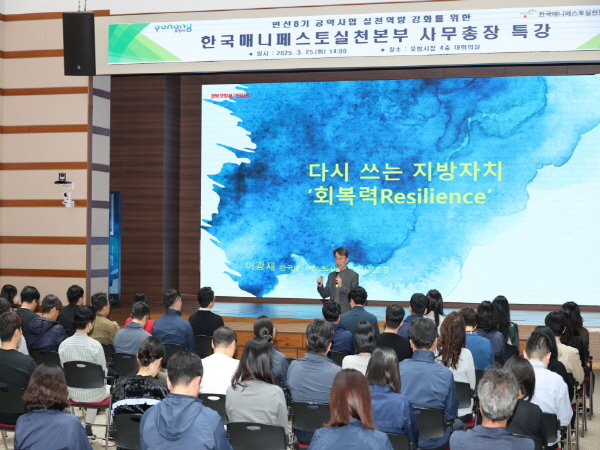 이날 특강은 이광재 한국매니페스토실천본부 사무총장을 초청해 ‘다시 쓰는 지방자치 회복력(Resilience)’를 주제로 민선 8기 공약사업 담당 공무원 100여 명을 대상으로 진행했다.
