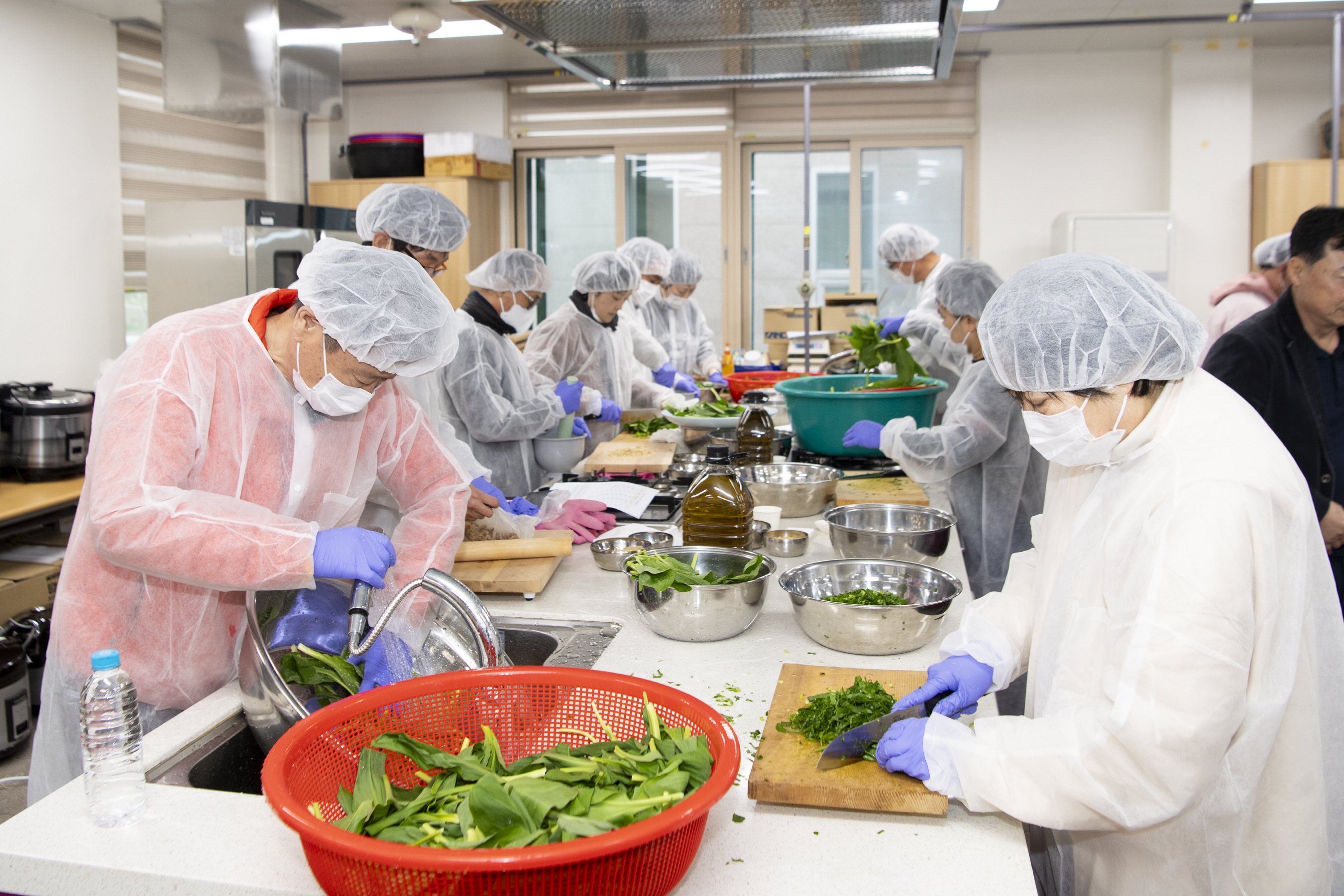 울릉군 농업기술센터에서 명이나물을 활용한 명이페스토 만들기에 열중인 참가자들