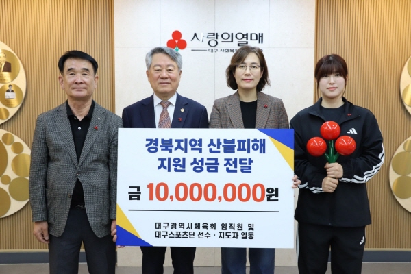 (경북=NSP통신) 김대원 기자 = 대구광역시체육회는 7일 경북 산불 피해 지역 복구를 위해 성금 1000만 원을 대구사회복지공동모금회(사랑의열매)에 전달했다.