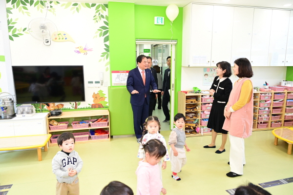 배낙호 시장은 먼저 대표적인 공보육 시설인 김천율곡어린이집을 찾아 실제 보육 환경을 직접 체험하고 점검했다.