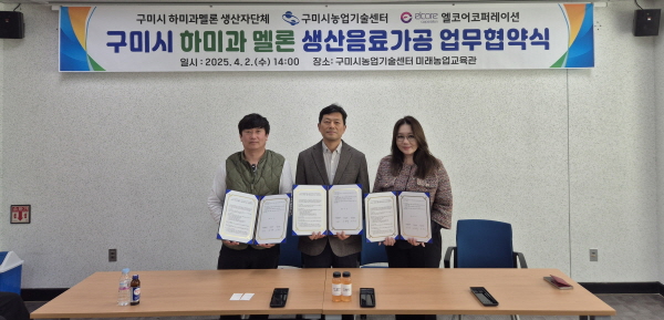 구미시는 지난 2일 농업기술센터 미래농업교육관에서 하미과멜론생산자단체, 엘코어코퍼레이션과 하미과 멜론의 생산 및 음료 가공을 위한 업무협약을 체결했다. (사진 = 구미시)