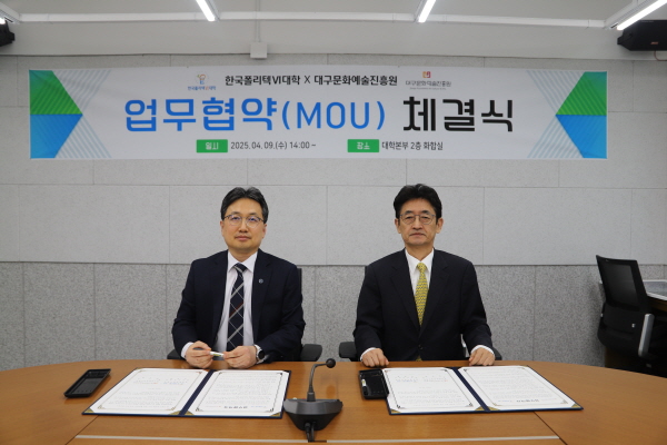 (경북=NSP통신) 김대원 기자 = 대구문화예술진흥원(원장 박순태, 이하 ‘진흥원’)이 한국폴리텍Ⅵ대학(학장직무대리 노진호, 이하 ‘폴리텍대학’)과 지난 9일 폴리텍대학에서 업무협약을 체결했다. 이번 협약을 통해 양 기관은 기술·예술 융합 창작 환경을 조성하고 학생들의 문화예술 향유 기회를 확대하는 데 협력할 계획이다.