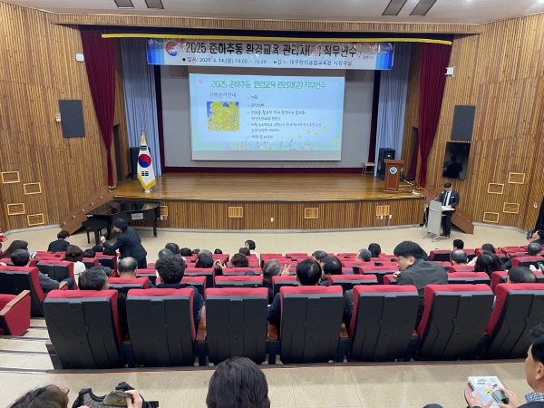(경북=NSP통신) 김대원 기자 = 대구시교육청(교육감 강은희)은 14일 대구창의융합교육원 시청각실에서 생태전환교육 실천학교 교장 및 환경교육에 관심 있는 교장 등 104명을 대상으로 ‘2025 춘하추동 환경교육 관리자(춘) 직무연수’를 실시했다.