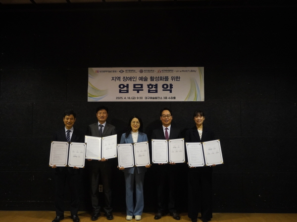 (경북=NSP통신) 김대원 기자 = 대구문화예술진흥원(원장 박순태, 이하 ‘문예진흥원’)과 관내 특수학교 3개(대구광명학교, 대구성보학교, 대구예아람학교), 사회적기업 러플이 18일 업무협약을 체결했다.