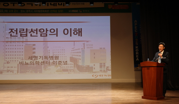 (경북=NSP통신) 조인호 기자 = 포항세명기독병원(병원장 한동선) 비뇨의학센터 이준녕 센터장이 지난 22일 경주서라벌문화회관에서 열린 경주시 주최 ‘경주행복아카데미’에서 ‘전립선암의 이해’라는 주제로 강연을 펼쳤다.