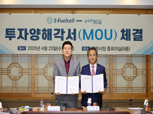 (경북=NSP통신) 조인호 기자 = 포항시는 23일 국내 대표 수소연료전지 전문기업인 에스퓨얼셀과 200억 원 규모의 투자양해각서(MOU)를 체결했다.