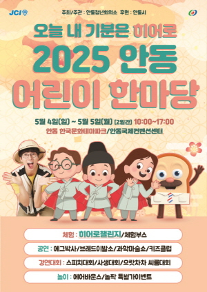 (경북=NSP통신) 김오현 기자 = 안동시와 안동청년회의소는 제103회 어린이날을 맞이해 5월 4일부터 5월 5일까지 2일간 한국문화테마파크와 안동국제컨벤션센터 일대에서 ‘2025 안동 어린이 한마당’을 개최한다.