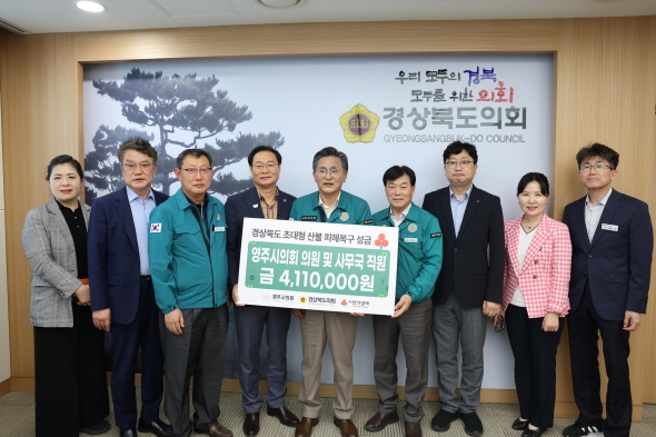 (경북=NSP통신) 김오현 기자 = 영주시의회(김병기 의장)는 최근 경북 지역에서 발생한 대형산불로 인해 피해를 입은 지역 주민들을 돕기 위해 성금 411만원을 경상북도사회복지공동모금회에 기탁했다.