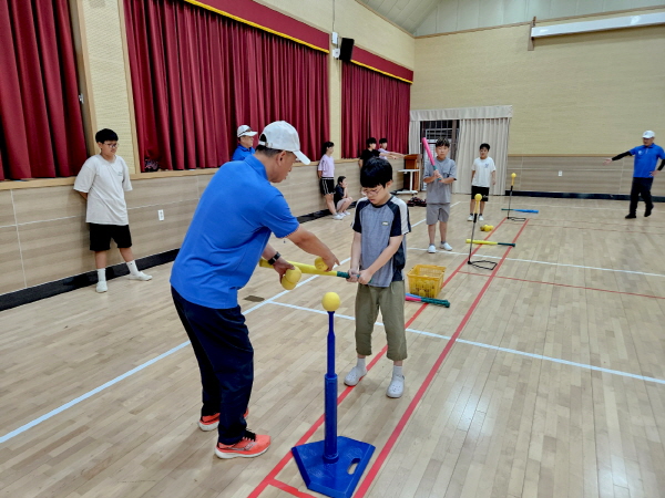 NSP통신-지난해 7월 영진전문대학교 스포츠재활과가 지리산 인근에 있는 마천초등학교를 방문해 찾아가는 티볼교실 재능기부를 펼치는 모습 (사진 = 영진전문대학교)