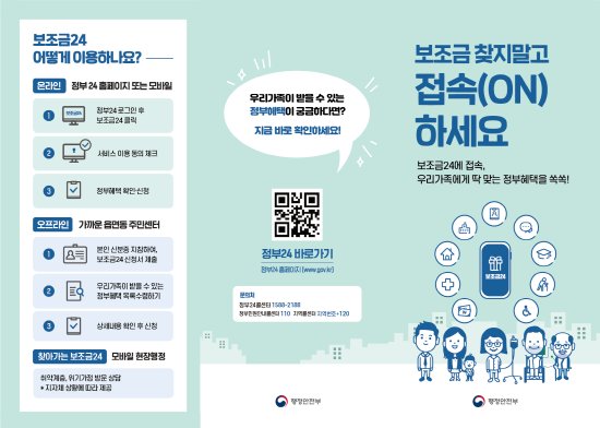 온라인 이용은 정부24 로그인 후 보조금24 이용 동의를 거치면 본인과 14세 미만 자녀가 받을 혜택을 조회할 수 있다.