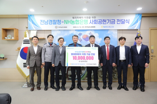 (전남=NSP통신) 김성철 기자 = 전남경찰청(청장 이충호)은 NH농협은행 전남본부(본부장 정재헌)와 사회공헌기금 기탁 업무협약을 체결하고, 범죄피해자 보호·지원을 위한 기금 1000만 원 전달식을 가졌다.