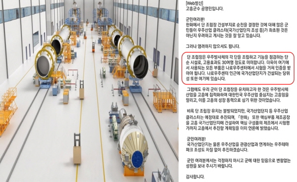 ![NSP통신-한화에어로스페이스가 우주발사체 단조립장을 설치할 내부 조감도와 공영민 고흥군수가 군민들에게 발송한 문자 내용[사진=순천시과 순천독립신문]](https://file.nspna.com/news/2023/04/19/20230419105557_632541_1.jpg)