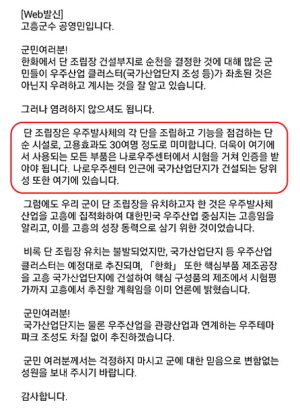 (전남=NSP통신) 위종선 기자 = 공영민 고흥군수는 한화에어로스페이스의 우주발사체 단 조립장 부지 유치가 실패되자 군민들에게 펨훼성 내용이 담긴 문자를 발송해 논란이 확대될 것으로 전망된다.
