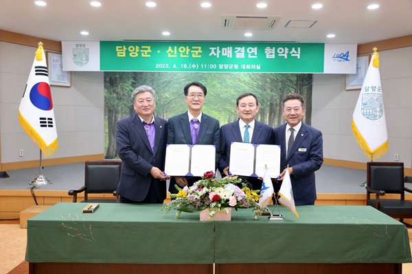 (전남=NSP통신) 김현 기자 = 전남 신안군은 4월 19일 담양군과 상호 교류와 협력으로 공동 발전을 도모하기 위한 자매결연 협약을 체결했다.