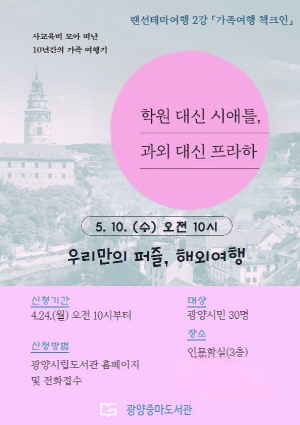 (전남=NSP통신) 김성철 기자 = 광양중마도서관은 오는 5월 10일 도서관 인문학실에서 랜선테마여행 제2차 강연인 가족여행 책크인 ’우리만의 퍼즐, 해외여행‘ 특강을 운영한다고 밝혔다.