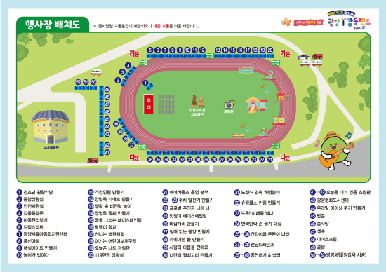 또한 경찰, 소방, 병영, 병원 직업체험 등 실감 나는 체험이 이뤄지고 장갑차 시승도 할 수 있도록 마련됐으며, 33개 기관·단체가 참여한 38개의 체험놀이마당, 에어바운스존, 먹거리 나눔 마당, 감동 득템존 등 온 가족들에게 감동과 재미를 한가득 선물할 예정이다.