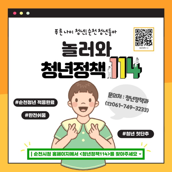 플랫폼은 순천시청 누리집 중앙 좌측의 청록색 ‘청년정책114’ 버튼을 클릭하거나, 이벤트 카드뉴스의 QR코드를 통해 들어갈 수 있다.
