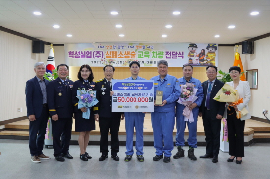 행사에서는 혁성실업 관계자, 광양시 남성·여성 연합회장, 소방발전위원회 회장 그리고 광양소방서장 및 직원 30명이 참석해 행사를 빛내주었으며, 주요 내용으로는 ▲심폐소생술 교육차량 전달(5000만 원) ▲감사패 전달 ▲영웅이 CPR 퍼포먼스(교육시연) 등으로 진행됐다.