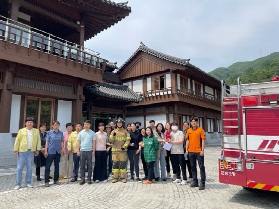 훈련은 목재문화체험장 2층 동백공방에서 원인 미상의 화재 발생을 가정해 소방훈련 매뉴얼에 따라 ▲신속한 화재 신고 ▲화재 발생 경보전파 ▲자위소방대의 화재 초기 진압 등으로 진행됐다.
