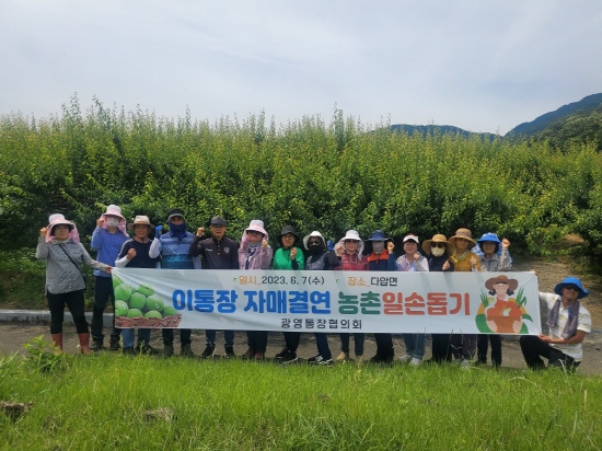 광영동 통장협의회는 해마다 영농철 일손 부족으로 어려움을 겪고 있는 농가를 대상으로 매실 수확과 선별 작업을 돕는 등 봉사활동을 펼쳐 왔으며 지역사회 봉사와 이웃사랑 분위기를 확산시켰다.