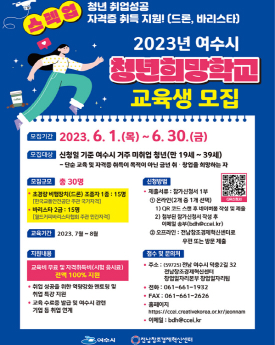 (전남=NSP통신) 서순곤 기자 = 여수시(시장 정기명)가 미취업 지역청년에게 전문자격 취득 기회를 제공하는 ‘청년희망학교’ 참여자를 오는 30일까지 모집한다.