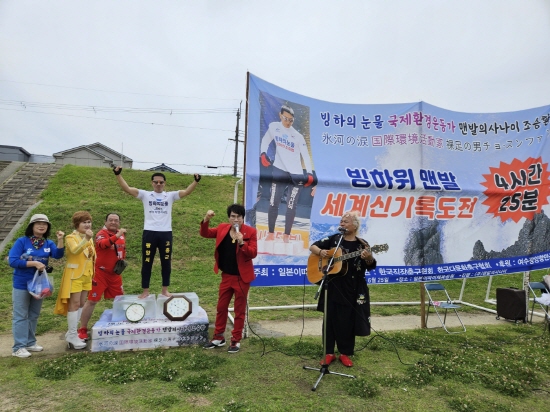 (전남=NSP통신) 김성철 기자 = 광양시 홍보대사 ‘맨발의 사나이’ 조승환 씨가 지난 25일 일본 오사카시에서 또 한 번 자신의 ‘얼음 위 맨발로 서 있기’ 세계신기록을 깼다고 밝혔다.