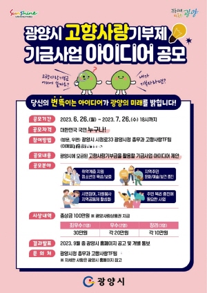 (전남=NSP통신) 김성철 기자 = 광양시는 고향사랑기부제 시행으로 모금된 기부금을 활용해 기부자가 공감하고 지역주민이 체감하는 기금사업을 발굴하기 위해 6월 26일~7월 26일까지 고향사랑기부제 기금사업 아이디어 공모전을 진행한다고 밝혔다.