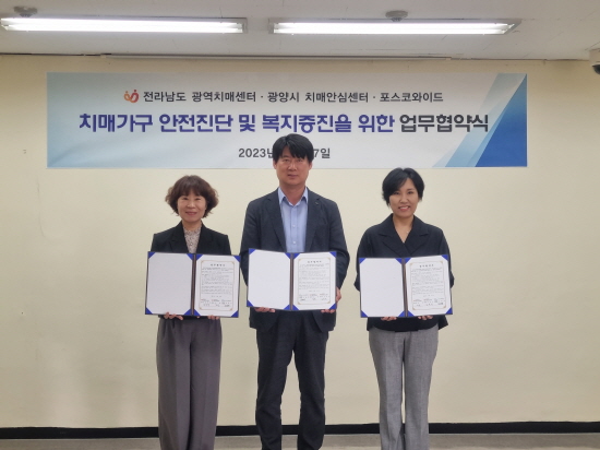 (전남=NSP통신) 김성철 기자 = 광양시치매안심센터는 지난 27일 전라남도광역치매센터, 포스코와이드와 치매환자 등 취약계층 안전환경 조성을 위한 업무 협약을 체결했다.