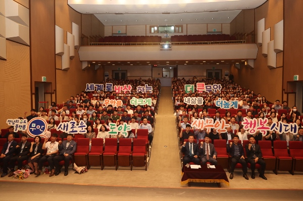 승달예술회관에서 전 직원이 참여한 정례조회는 모범공무원 시상을 시작으로 1년간 성과, 군민의 생생한 현장 영상, 민선 8기 공약사항을 시청하고 민선 8기 2년 차 새로운 다짐을 외치는 군정 구호와 청렴 결의대회로 마무리 지었다.