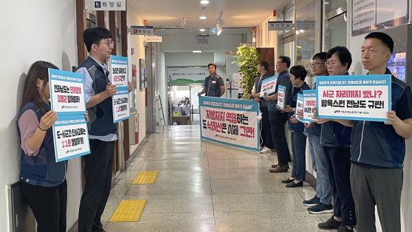 NSP통신-전국공무원노동조합 전남지역본부가 순천시 부시장실 앞에서 새로 부임한 부시장 출근길을 막고 있다.[사진=공무원노조]